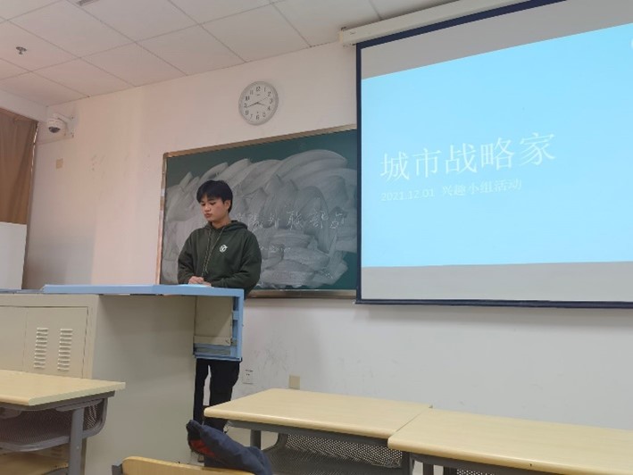 12月1日下午,“兴趣与创客”第四小组---“城市战略家”--城市发展战略兴趣小组”举办了第一次小组活动。19级城市经济管理班的黄乔宇、玉美贞,20级城市经济管理班的张一铭、张雨晴、张帆、董思琪、刘钟歈等同学参加了这次兴趣小组活动。活动初始,“城市战略家”小组组长黄乔宇做了开展第一次活动的发言。