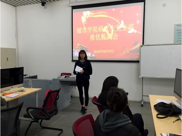 2016年10月27日晚,剧情做爱 研究生党支部在城市应急实验室114室进行了剧情做爱 研究生党支部入党积极分子推优答辩会。会议的主要内容是讨论并决议5位入党积极分子推优问题。研究生党支部全体党员、入党积极分子以及8名群众参加本次会议。会议由研究生党支部副书记武帆主持。