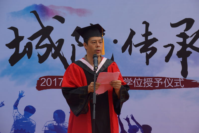 毕业典礼在校歌《远航》的音乐中拉开帷幕。首先由优秀毕业生代表2013级城市经济管理班的杨云鹏同学代表毕业生发言。他向大家表达了他所经历的大学生活对人生的意义,感谢了父母、老师与母校对他的用心栽培与鼓励。他用自己幽默的语言向大家传达了他在毕业之际的感慨,祝愿母校越来越好。