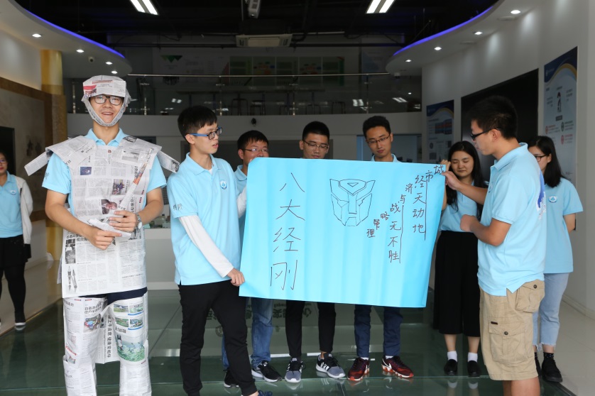第三项进行的是“团队风采展示”活动,大家按照专业分组,共五组,每个专业用彩笔和卡纸创作自己团队的队徽,构思团队口号和队歌,另外还需要根据抽中的人物主题利用报纸和胶带做造型,虽然只有十几分钟的时间,但大家都以巧妙新颖的构思、大胆的造型设计和口才征服了在场所有人。在每个专业展示之后,产生五个最佳奖项:2017级行政管理研究生班荣获“最佳团队奖”,2017级区域经济研究生班获得“最佳展示奖”,2017级城市经济与战略管理研究生班获得“最佳设计奖”,2017级教育经济与管理研究生班获得“最佳人气奖”,2017级土地资源管理研究生班获得“最佳造型奖”。研究生新生班主任张帆老师为获奖团队颁发奖品。