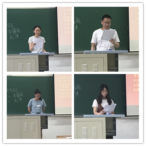 会议主要围绕两大内容开展,第一项内容是接受邹碧莹、董建振、陆园园、王利娟、李帅五位同学为预备党员的讨论,5名发展对象先后上台宣读入党志愿书,培养人对发展对象情况进行介绍发言,并由党支部委员宣读考察报告。由全体党员对发展对象进行投票表决,最终表决全票通过,邹碧莹等5名同学成为中共预备党员,面向党旗庄严宣誓,并表示将以实际行动履行自己的誓言,为共产主义奋斗终身,全体正式党员对以上同志致以热烈的掌声。