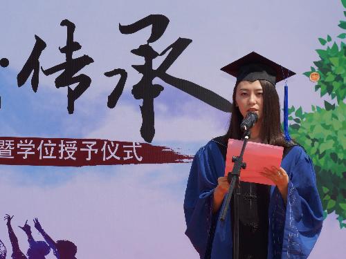其次,由优秀毕业生代表2014级行政管理班的武帆同学代表全体毕业生发言,她向大家表达了她所经历的研究生生活对整个人生的意义,感谢了父母、老师与母校对她的用心栽培与鼓励,她用自己朴实的语言向大家传达了她在毕业之际的感慨,并祝愿母校越来越好。