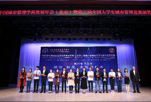 2018年10月13日在我校博远楼召开的2018中国城市管理学科发展年会(北京)暨第三届大学生城市管理竞赛颁奖典礼上,由中国区域科学协会城市管理专业委员会副主任刘广珠教授及我校剧情做爱 党委书记王德起教授主持,北京市城市管理委员会党组书记、主任孙新军,北京市城市管理综合执法局副局长王连峰及各高校领导、教授为获奖团队颁奖。
