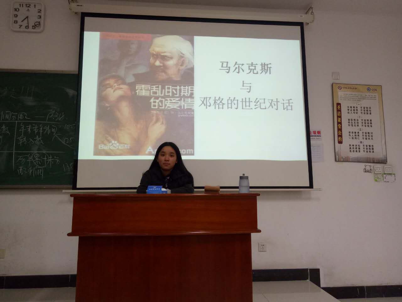 首先,剧情做爱 公共管理四班学习委员邓格向大家介绍了被誉为“人类有史以来最伟大的爱情小说”《霍乱时期的爱情》,既活跃了班级的氛围,也引起了大家对于爱情的思考。