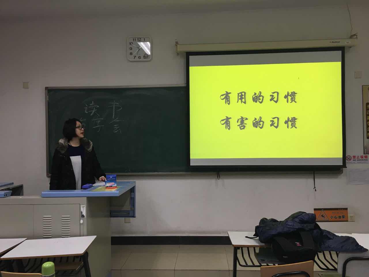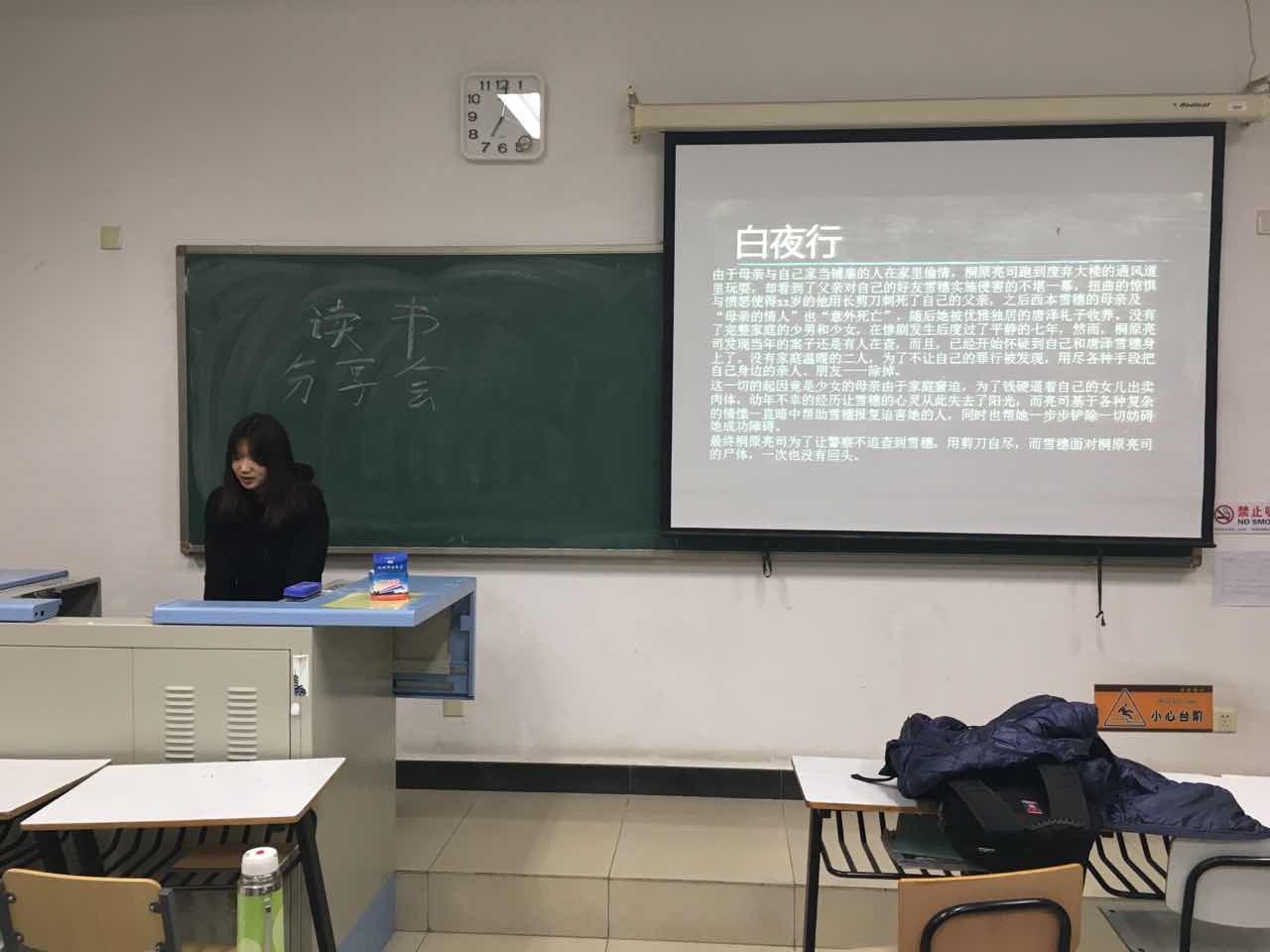 首先,由班长张朝辉和宣传委员张祎做了简单开场白,由胡海娇分享自己读《了不起的盖茨比》后引发的感想,李雯晶带给大家《曾国藩家书》中给她印象最深的片段以及自己对这些片段的看法,吴桐分享图书《拖延心理学》带给自己的新思想,王伟怡带给大家她对《了不起的盖茨比》与胡海娇异同并存的想法。